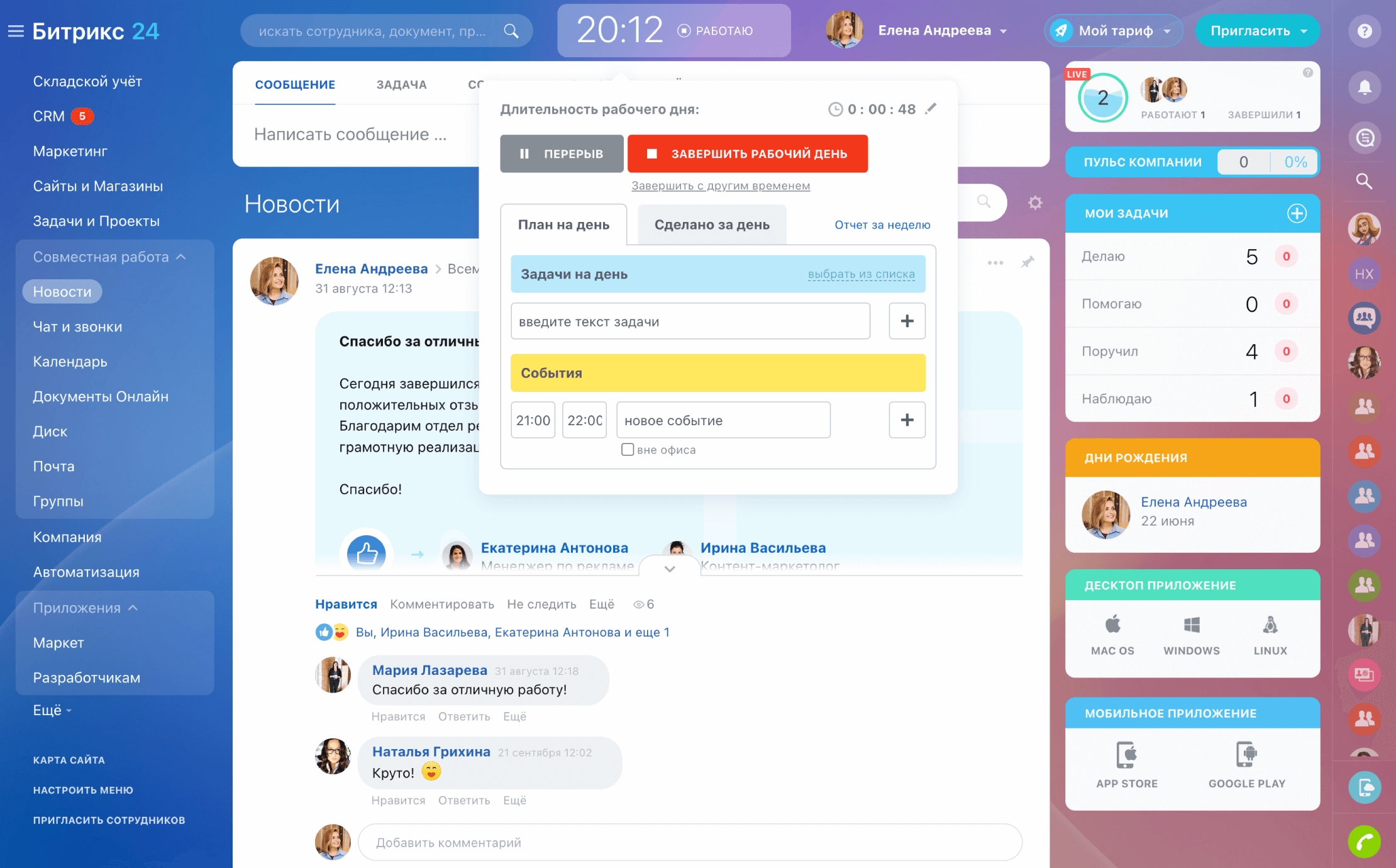 Каналы связи: Битрикс24, соцсети, электронная почта, менеджеры